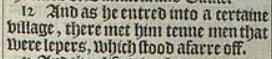 12 And as he entred into a certaine village, there met him tenne men that were lepers, which stood afarre off.