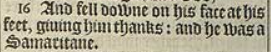 16 And fell downe on his face at his feet, giuing him thanks: and he was a Samaritane.