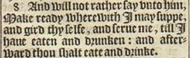 8 And will not rather say vnto him, Make ready wherewith I may suppe, and gird thy selfe, and serue me, till I haue eaten and drunken: and afterward thou shalt eate and drinke.