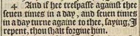 4 And if hee trespasse against thee seuen times in a day, and seuen times in a day turne againe to thee, saying, I repent, thou shalt forgiue him.