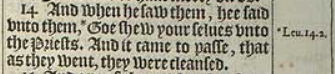 14 And when he saw them, hee said vnto them, *Goe shew your selues vnto the Priests. And it came to passe, that as they went, they were cleansed.[*Leu.14. 2.]