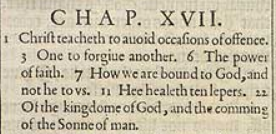 1 Christus lehrt, Gelegenheiten der Verleitung zu meiden. 3 Einer soll dem anderen vergeben. 6 Die Kraft des Glaubens. 7 Wie wir an Gott gebunden sind und nicht er an uns. 11 Er heilt zehn Aussätzige. 22 Von dem Königreich Gottes und dem Kommen des Menschensohns.
