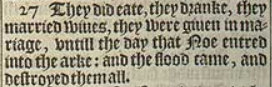 27 They did eate, they dranke, they married wiues, they were giuen in mariage, vntill the day that Noe entred into the arke: and the flood came, and destroyed them all.