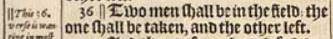 36 || Two men shall be in the field; the one shall be taken, and the other left.[|| This 36. verse is wanting in most of the Greek copies.]