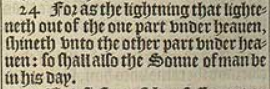 24 For as the lightning that lighteneth out of the one part vnder heauen, shineth vnto the other part vnder heauen: so shall also the Sonne of man be in his day.