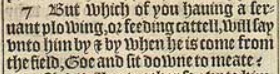 7 But which of you hauing a seruant plowing, or feeding cattell, will say vnto him by & by when he is come from the field, Goe and sit downe to meate?