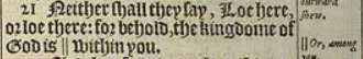 21 Neither shall they say, Loe here, or loe there: for behold, the kingdome of God is || within you.[|| Or, among you.]