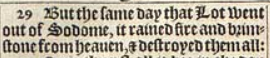 29 But the same day that Lot went out of Sodome, it rained fire and brimstone from heauen, & destroyed them all:
