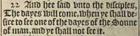 22 And hee said vnto the disciples, The dayes will come, when ye shall desire to see one of the dayes of the Sonne of man, and ye shall not see it.