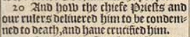 20 And how the chiefe Priests and our rulers deliuered him to be condemned to death, and haue crucified him.