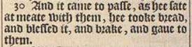 30 And it came to passe, as hee sate at meate with them, hee tooke bread, and blessed it, and brake, and gaue to them.