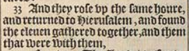 33 And they rose vp the same houre, and returned to Hierusalem, and found the eleuen gathered together, and them that were with them,