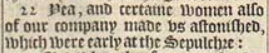 22 Yea, and certaine women also of our company made vs astonished, which were early at the Sepulchre: