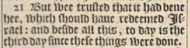 21 But wee trusted that it had bene hee, which should haue redeemed Israel: and beside all this, to day is the third day since these things were done.