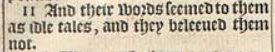 11 And their words seemed to them as idle tales, and they beleeued them not.