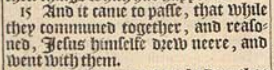 15 And it came to passe, that while they communed together, and reasoned, Iesus himselfe drew neere, and went with them.
