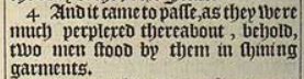 4 And it came to passe, as they were much perplexed thereabout, behold, two men stood by them in shining garments.