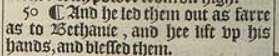 50 ¶ And he led them out as farre as to Bethanie, and hee lift vp his hands, and blessed them.
