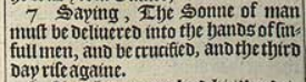 7 Saying, The Sonne of man must be deliuered into the hands of sinfull men, and be crucified, and the third day rise againe.