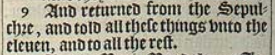 9 And returned from the Sepulchre, and told all these things vnto the eleuen, and to all the rest.