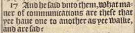 17 And he said vnto them, What maner of communications are these that yee haue one to another as yee walke, and are sad?