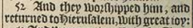 52 And they worshipped him, and returned to Hierusalem, with great ioy: