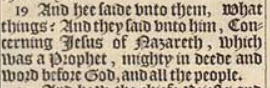 19 And hee saide vnto them, What things? And they said vnto him, Concerning Iesus of Nazareth, which was a Prophet, mighty in deede and word before God, and all the people.