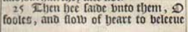 25 Then hee saide vnto them, O fooles, and slow of heart to beleeue all that the Prophets haue spoken: