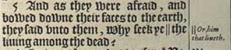 5 And as they were afraid, and bowed downe their faces to the earth, they said vnto them, Why seek ye || the liuing among the dead?[|| Or, him that liueth.]