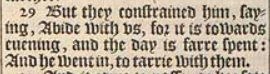29 But they constrained him, saying, Abide with vs, for it is towards euening, and the day is farre spent: And he went in, to tarrie with them.