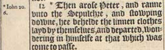 12 *Then arose Peter, and ranne vnto the Sepulchre, and stowping downe, hee behelde the linnen clothes layd by themselues, and departed, wondering in himselfe at that which was come to passe.[*Iohn 20.6.]