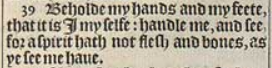 39 Beholde my hands and my feete, that it is I my selfe: handle me, and see, for a spirit hath not flesh and bones, as ye see me haue.