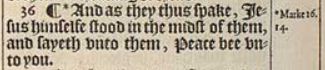 36 ¶ *And as they thus spake, Iesus himselfe stood in the midst of them, and sayeth vnto them, Peace bee vnto you.[*Marke 16.14.]