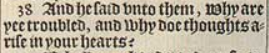 38 And he said vnto them, Why are yee troubled, and why doe thoughts arise in your hearts?