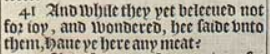 41 And while they yet beleeued not for ioy, and wondered, hee saide vnto them, Haue ye here any meat?
