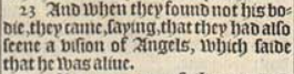 23 And when they found not his bodie, they came, saying, that they had also seene a vision of Angels, which saide that he was aliue.