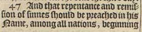 47 And that repentance and remission of sinnes should be preached in his Name, among all nations, beginning at Hierusalem.