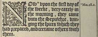 1 Now *vpon the first day of the weeke, very earely in the morning, they came vnto the Sepulchre, bringing the spices which they had prepared, and certaine others with them.[*Mat.28.1.]