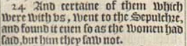 24 And certaine of them which were with vs, went to the Sepulchre, and found it euen so as the women had said, but him they saw not.