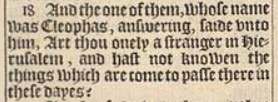 18 And the one of them, whose name was Cleophas, answering, saide vnto him, Art thou onely a stranger in Hierusalem, and hast not knowen the things which are come to passe there in these dayes?