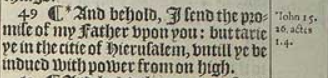 49 ¶ *Und siehe, ich schicke das Versprechen meines Vaters auf euch: Aber bleibt ihr in der Stadt Jerusalem, bis ihr mit Macht von oben versehen seid."[*Johannes 15.26 Apostelgeschichte 1:4]
