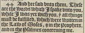 44 And hee said vnto them, These are the words which I spake vnto you, while I was yet with you, þt all things must be fulfilled, which were written in the Law of Moses, & in the Prophets, and in the Psalmes concerning me.
