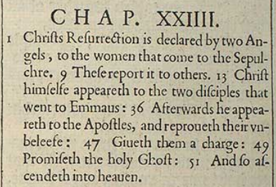 1 Christus' Auferstehung wird den Frauen, die zum Grab kommen, von zwei Engeln verkündet. 9 Diese berichten es anderen. 13 Christus selbst erscheint den beiden Jüngern, die nach Emmaus gingen: 36 Nachher erscheint er den Aposteln und tadelt ihren Unglauben: 47 Gibt ihnen einen Auftrag: 49 Verspricht den Heiligen Geist: 51 Und fährt so in den Himmel auf.