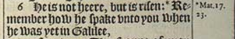 6 He is not heere, but is risen: *Remember how he spake vnto you when he was yet in Galilee,[*Mat.17.23.]
