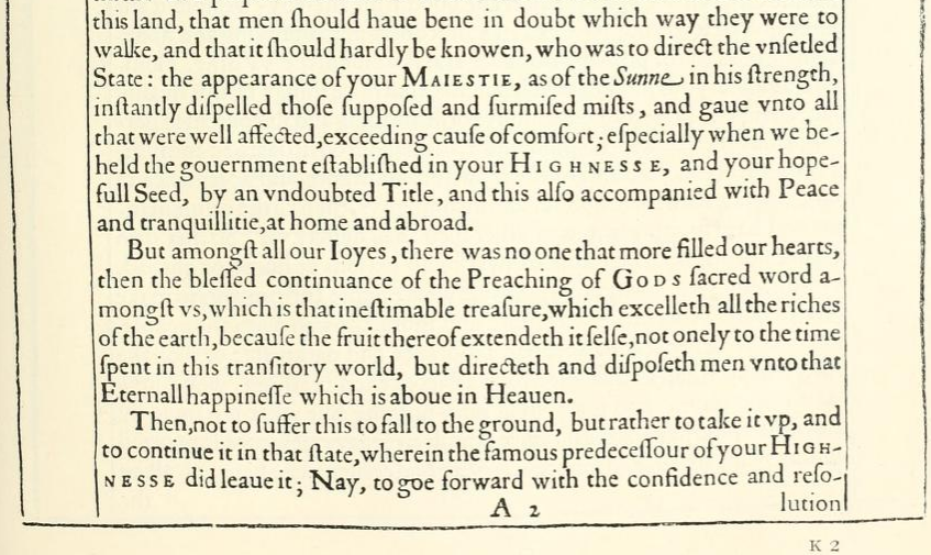 Groß und mannigfaltig waren die Segnungen (meist gefürchteter Souverän) welche der allmächtige GOTT, der Vater aller Erbarmen, uns dem Volk von ENGLAND geschenkt hat, als er ihn als erste Königliche Majestät zu herrschen sandte und uns zu regieren. Denn obgleich es die Erwartung Vieler war, die unserem ZION nicht wohl gesonnen waren, dass unter dem Einfluss des weisen abendländischen Sterns Königin ELISABETH im glücklichsten Gedenken einige dicke und greifbare Wolken der Dunkelheit dieses Land überschatteten, sodass die Menschen darüber zweifelten welchen Weg sie gehen sollten und es kaum bekannt wurde, wer den unruhigen Staat lenken sollte: Das Erscheinen Ihrer MAJESTÄT vertrieb mit seiner Kraft der Sonne diese mutmaßlichen und eingebildeten Nebel und brachte all denen, die davon betroffen waren, außerordentlichen Anlass zum Trost; besonders wenn man die Regierung betrachtet, die von Ihrer HOHEIT errichtet wurde und die hoffnungsvolle Saat, mit unzweifelhaftem Titel und dies begleitet von Frieden und Ruhe, zuhause und im Ausland.