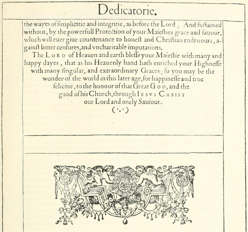 Und nun wurde es schließlich durch die Gnade GOTTES und die Beharrlichkeit unserer Arbeit zu einem solchen Abschluss gebracht, dass wir große Hoffnung haben, dass die Kirche Englands davon gute Früchte ernten wird; wir halten es für unsre Pflicht es Ihrer MAJESTÄT anzubieten, nicht nur als unserem König und Souverän, sondern als der wichtigsten Triebkraft und Autor des Werkes. Demütig erflehen wir von Ihrer heiligsten Majestät , da Dinge dieser Qualität schon immer Gegenstand übel gemeinten Tadels und missmutiger Personen waren, es möge Billigung und Protektion von einem so gelehrten und gerechten Prinzen wie Ihrer Hoheit empfangen, dessen Genehmigung und Freigabe unserer Arbeit uns mehr ehren und ermutigen, als all die Verleumdungen und harten Deutungen anderer Menschen uns entmutigen werden. Sodass, wenn einerseits päpstliche Personen zuhause oder im Ausland schlecht über uns reden, welche uns somit verleumden werden, weil wir die bedürftigen Werkzeuge sind, GOTTES heilige Wahrheit mehr und mehr den Menschen bekannt zu machen, welche sie weiterhin in Ignoranz und Dunkelheit halten wollen, oder wenn wir andererseits von verblendeten Brüdern verleumdet werden, die ihre eigenen Wege gehen und nur dem von ihnen selbst gestalteten und auf ihrem Amboss gehämmerten zustimmen, wir sicher ruhen mögen, innerlich gestützt von der Wahrheit und Unschuld eines guten Gewissens, den Wegen der Bescheidenheit und Integrität folgend, wie vor Gott; und unaufhaltsam, durch den kraftvollen Schutz der Güte und Wohlwollen Ihrer Majestät, die ehrlichen und christlichen Bemühungen immer Unterstützung geben wird, gegen erbitterte Kritik und unbarmherzige Unterstellungen.