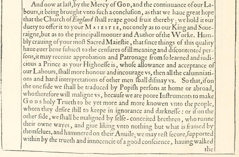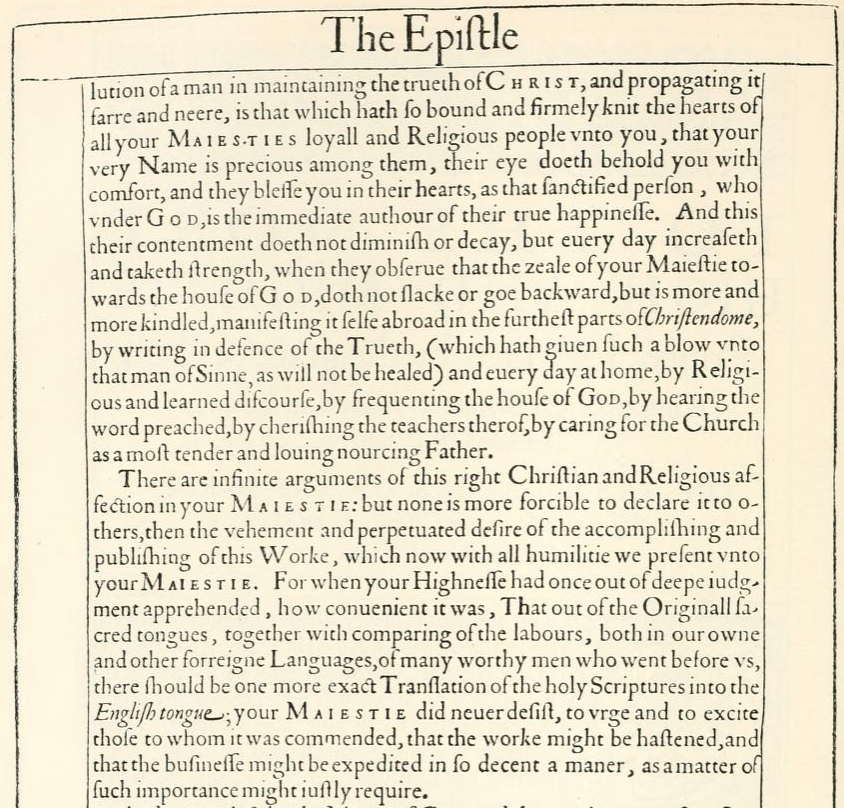 Da sind unendlich viele Beweise dieser richtigen christlichen und religiösen Neigung in Eurer MAJESTÄT: Aber keiner ist überzeugender es anderen zu erklären, als das vehemente und ewige Verlangen dieses Werk fertigzustellen und zu veröffentlichen, welches wir Eurer MAJESTÄT nun in aller Bescheidenheit präsentieren. Denn wenn Eure Hoheit erst aus tiefer Kenntnis heraus wahrnahm, wie tauglich es war, dass aus den geheiligten originalen Sprachen zusammen mit dem Vergleich mit den Arbeiten unserer eigenen und anderer Sprachen vieler würdiger Menschen, die vor uns kamen, eine weitere, exaktere Übersetzung der Bibel in die englische Sprache kommen sollte; Ihre Majestät hörte nie auf diejenigen anzutreiben und zu begeistern, denen dies aufgetragen war, damit die Arbeit beschleunigt würde und dass die Pflicht in so ordentlicher Weise ausgeführt würde, wie es eine Sache solcher Wichtigkeit zurecht verlangt.