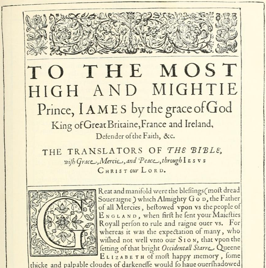 To the most high and mightie Prince, James by the grace of God King of Great Britaine, France and Ireland, Defender of the Faith, &c. The translators of The Bible, wish Grace, Mercie, and Peace, through Jesus Christ our Lord.