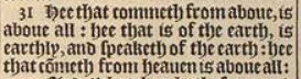 31 Hee that commeth from aboue, is aboue all: hee that is of the earth, is earthly, and speaketh of the earth: hee that cōmeth from heauen is aboue all: