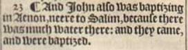 23 ¶ And Iohn also was baptizing in Aenon, neere to Salim, because there was much water there: and they came, and were baptized.